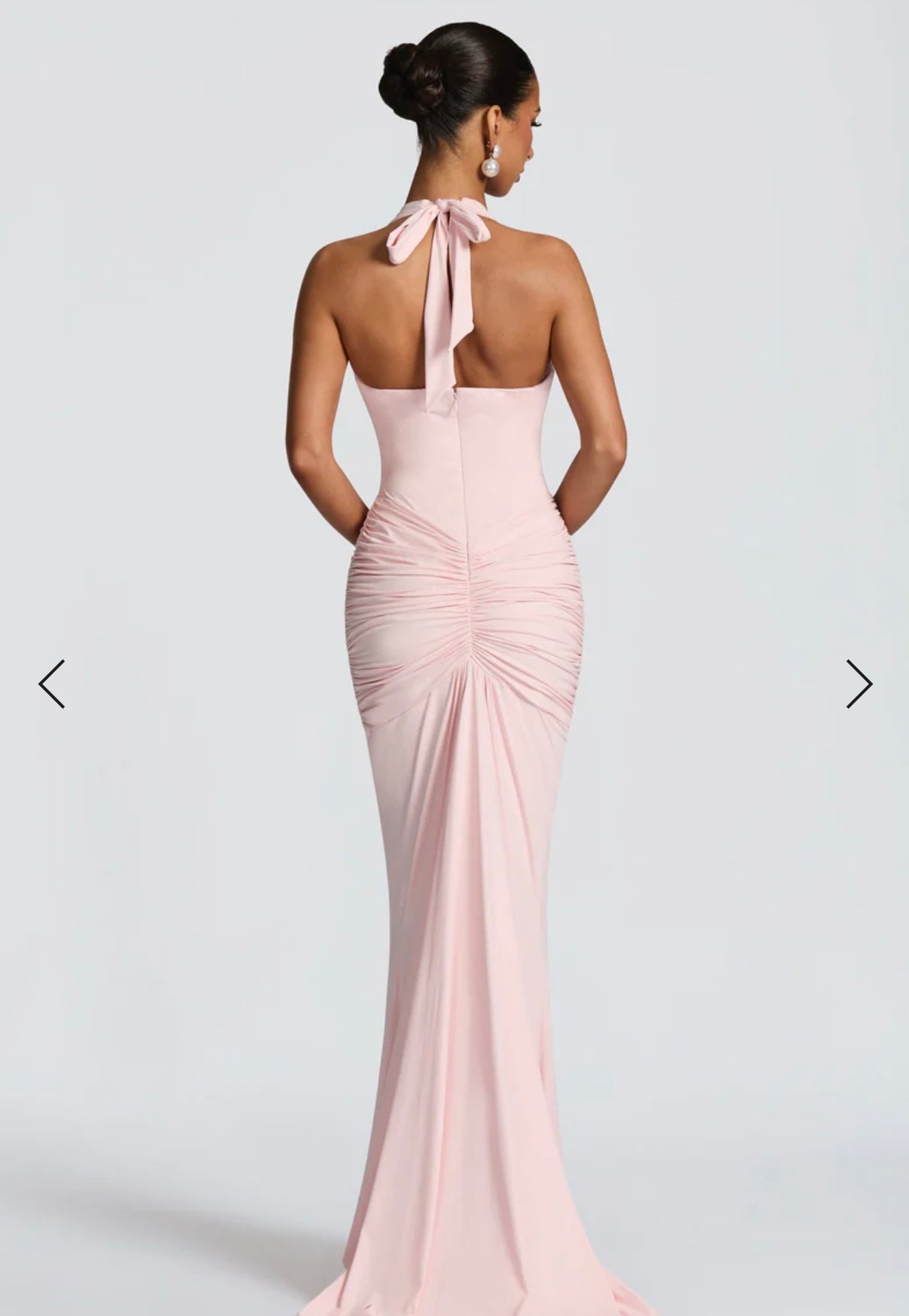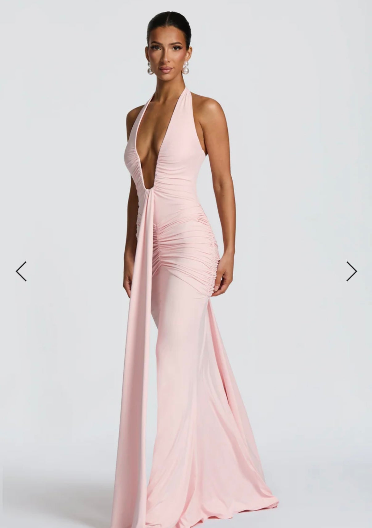 The Rosetta Maxi Dress in Blush features a slinky jersey fabric with a plunging halter neckline and gathering detail. A ruched panel accentuates the hips, leading to a full skirt with train and a long, draped center-front panel for an elegant, sophisticated look.